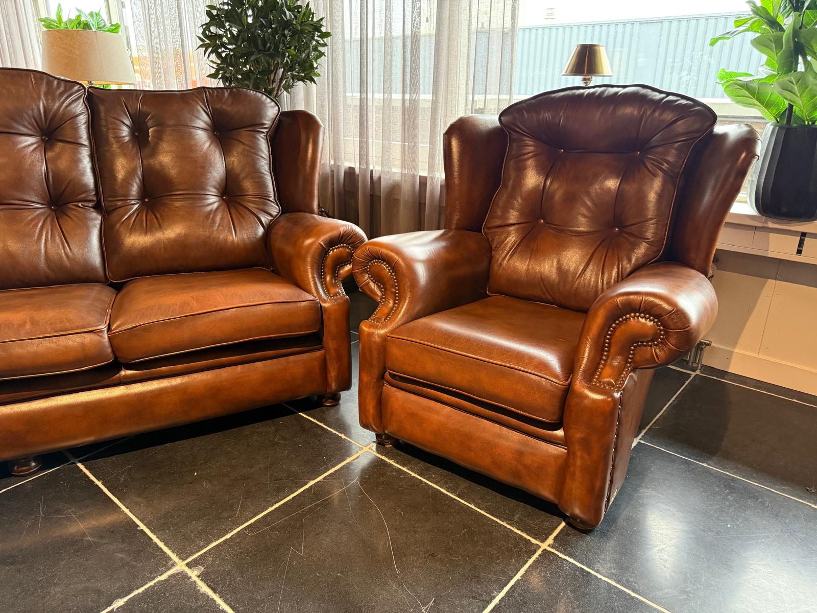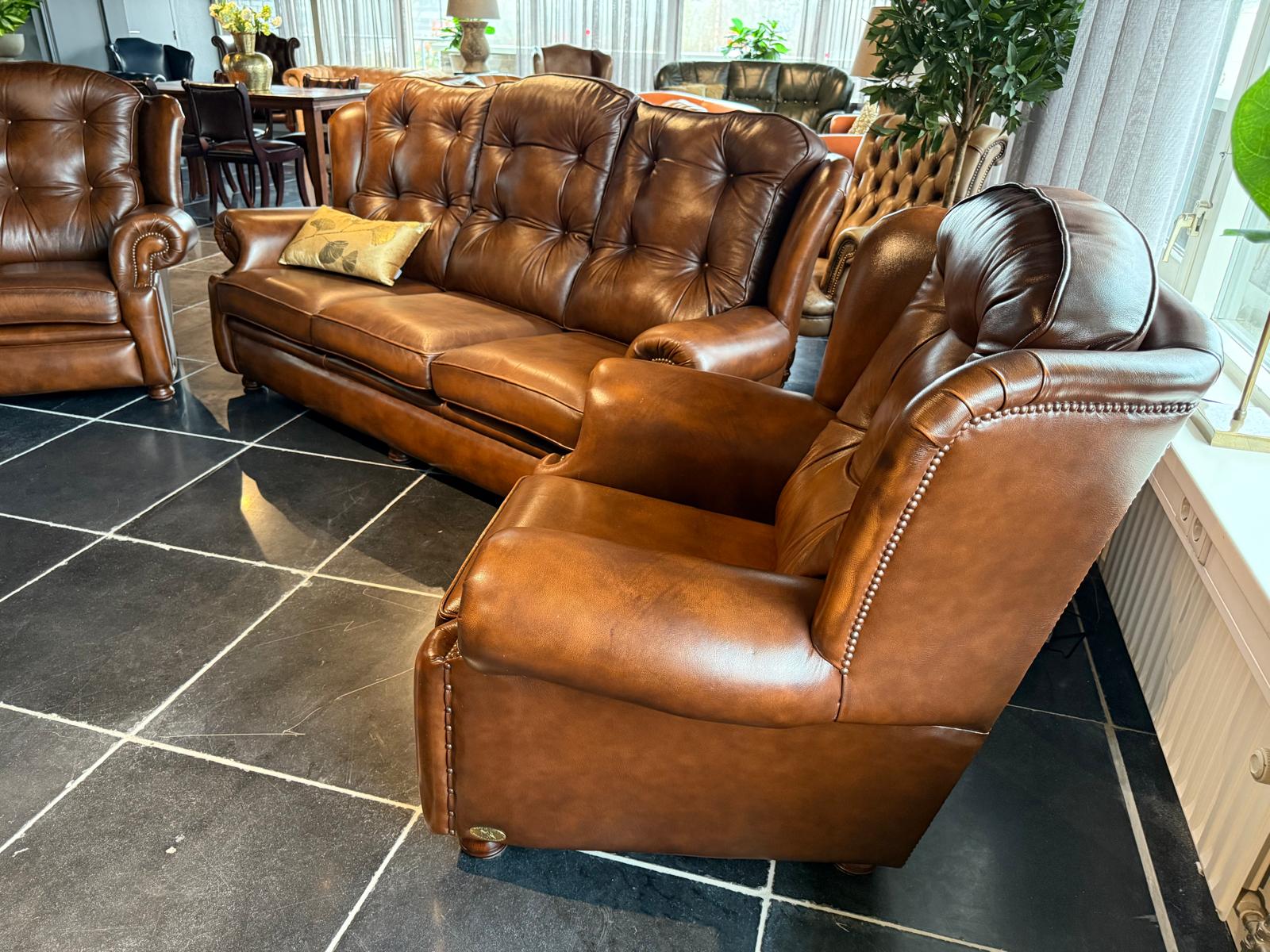 Een zeer nette onderhouden Suzanne 3,5 zits en 2 fauteuils in de bekende antique autumn tan.